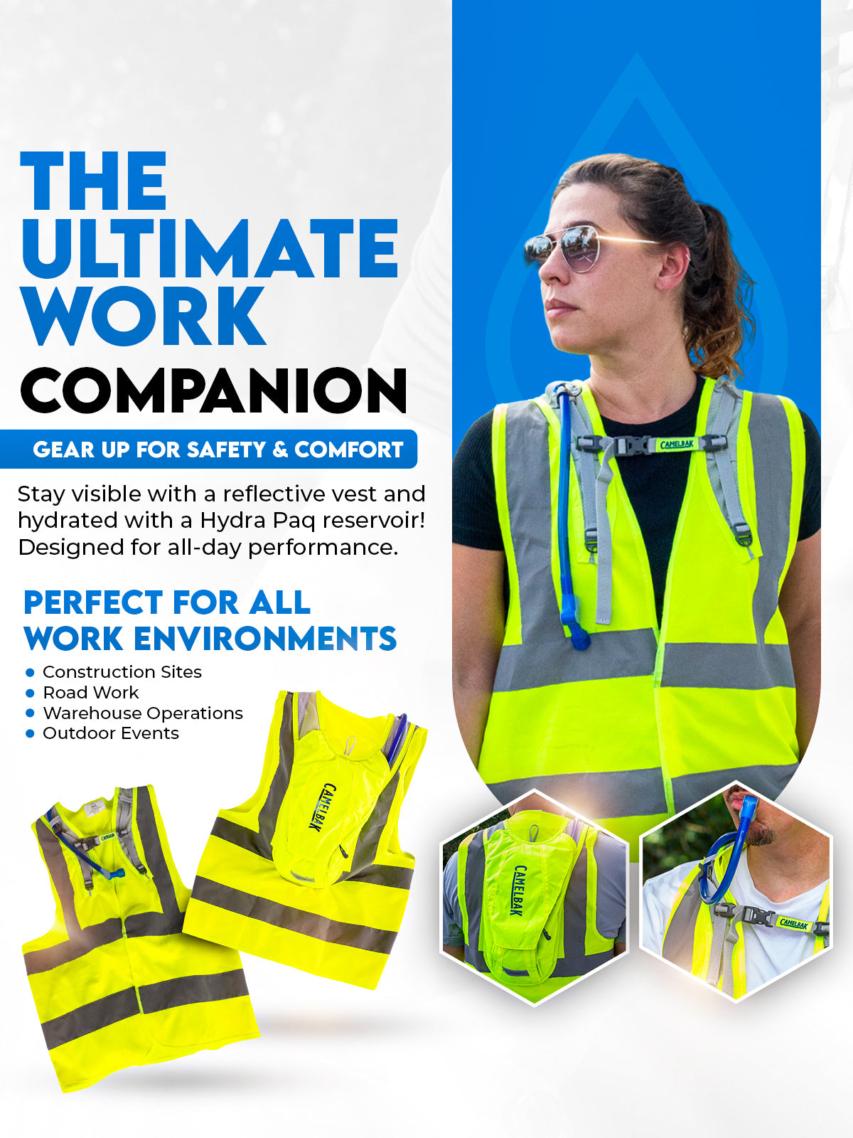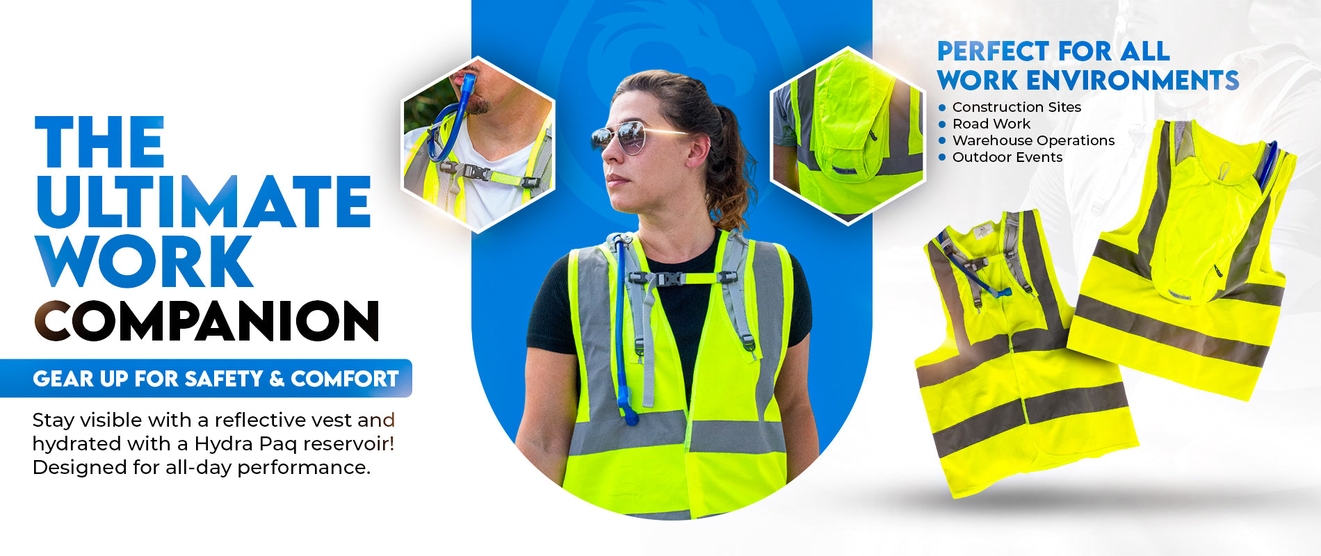 Introducing the HydraDefender Safety Vest with a Hydra Paq – the ultimate in seamless hydration and high-visibility safety gear. Perfect for demanding work environments where staying hydrated and visible is crucial.